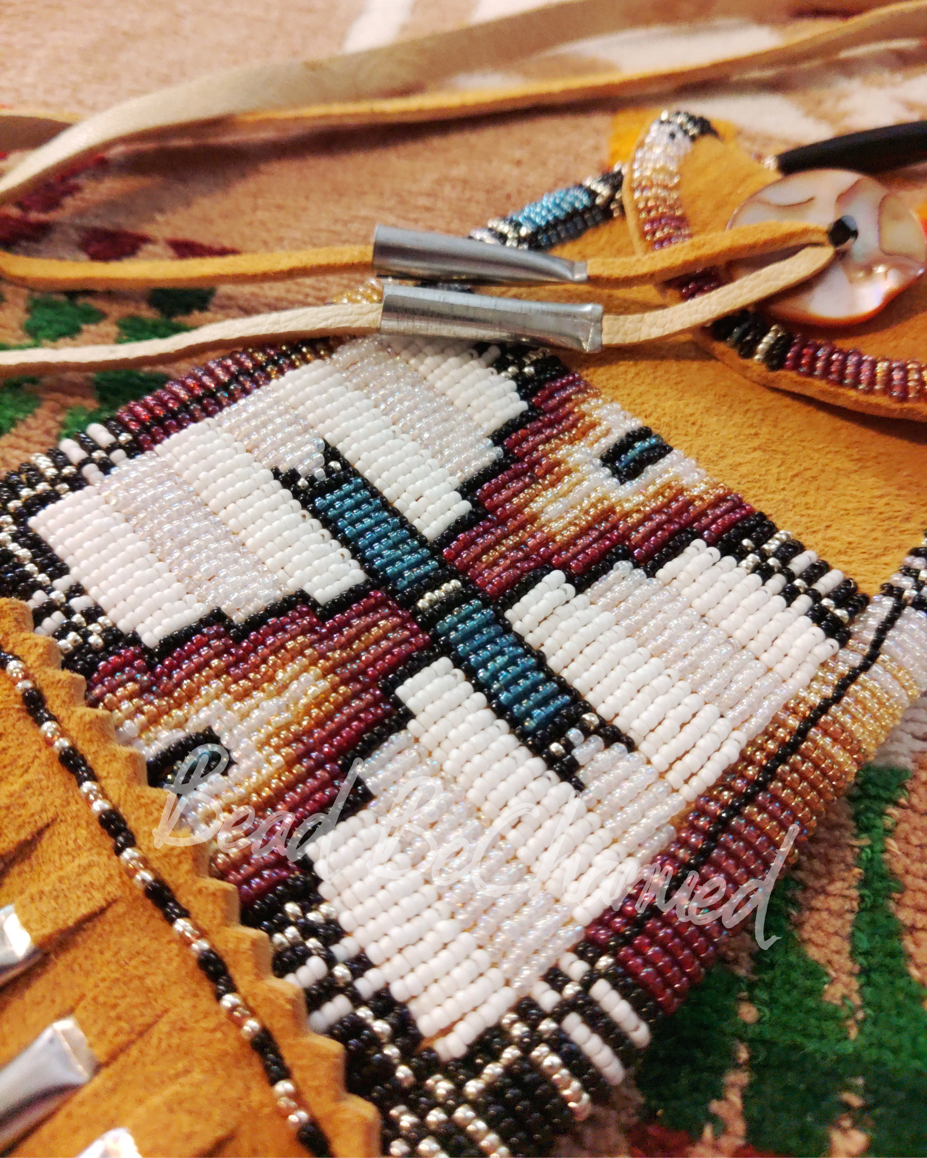 Here's a beautiful neck bag that would make a great gift for guys or gals. Crafted in the old Strike-a-Light Bag style with modern colors and decor, 'Rise' is a stunning example of old style blending with the new. Featuring bold beadwork designs in the sunrise colors, black, solid silver, chalk white and Montana Blue, its embellishments include tin cones, hand carved black horn hairpipe, vintage Swarovski crystals, and a Brown Lip shell disc on the flap.