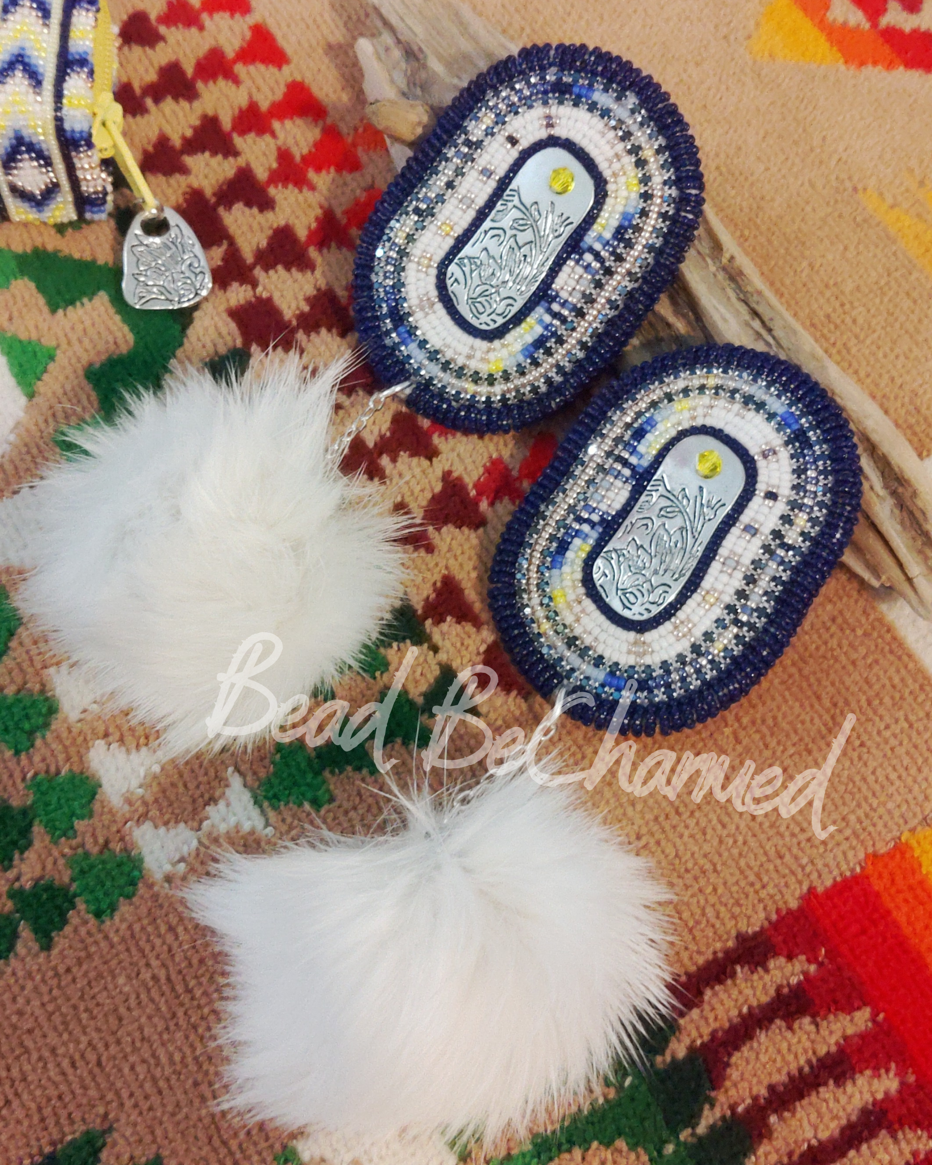 The matching earrings feature silver-plated etched dandelion charm focals, gold-plated beads, vintage Swarovski crystals, matching buckskin backing, heavy steel thumbnail earposts, and handmade rabbit fur pompoms that are stuffed with organic white sage for a faint, spirit-lifting scent. Rabbit fur pompoms are also made individually for each set - nothing here is mass produced!