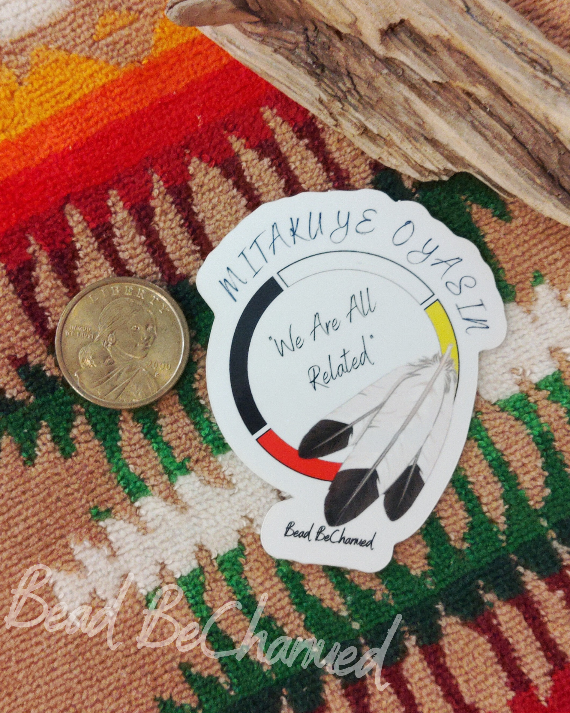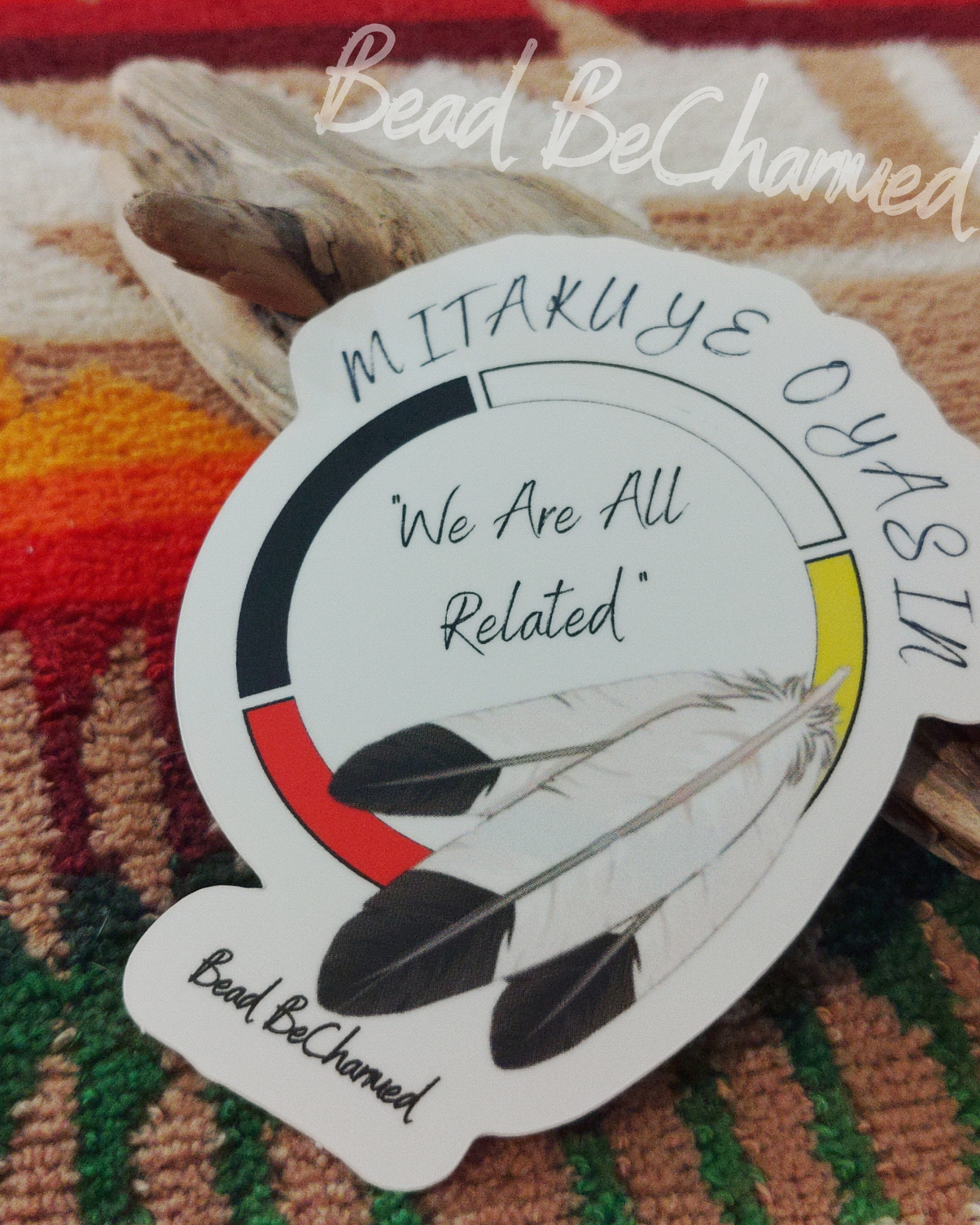 Mitakuye Oyasin - "We Are All Related", or sometimes translated to "All Our Relations", is often said at the end of a prayer, and is an important part of understanding Indigenous Spirituality. Framing the Four Directions medicine wheel and hanging feathers, this sticker represents the unity and world view of Indigenous cultures all over Turtle Island (North America). Show your support for Indigenous religions by proudly displaying this vinyl sticker for all to see!