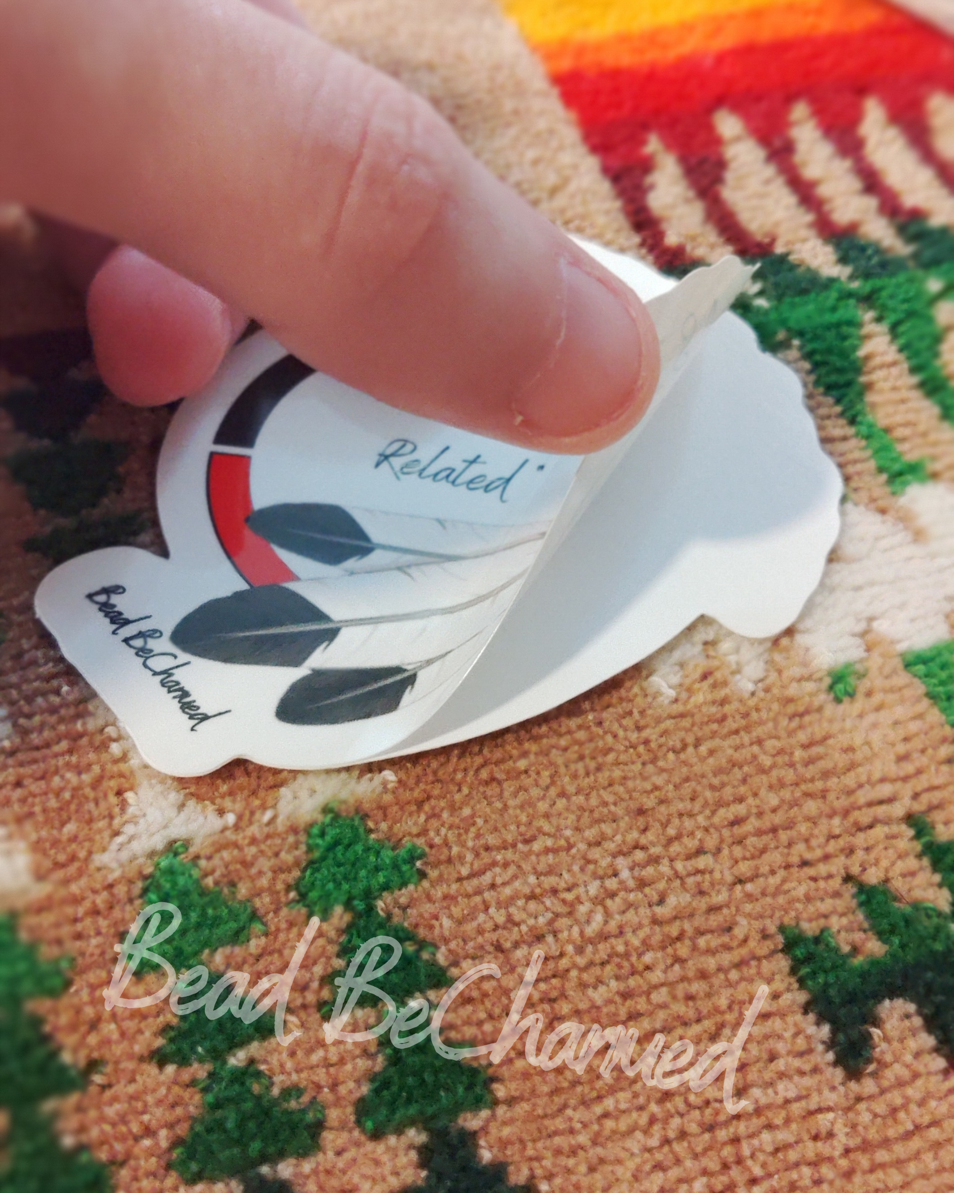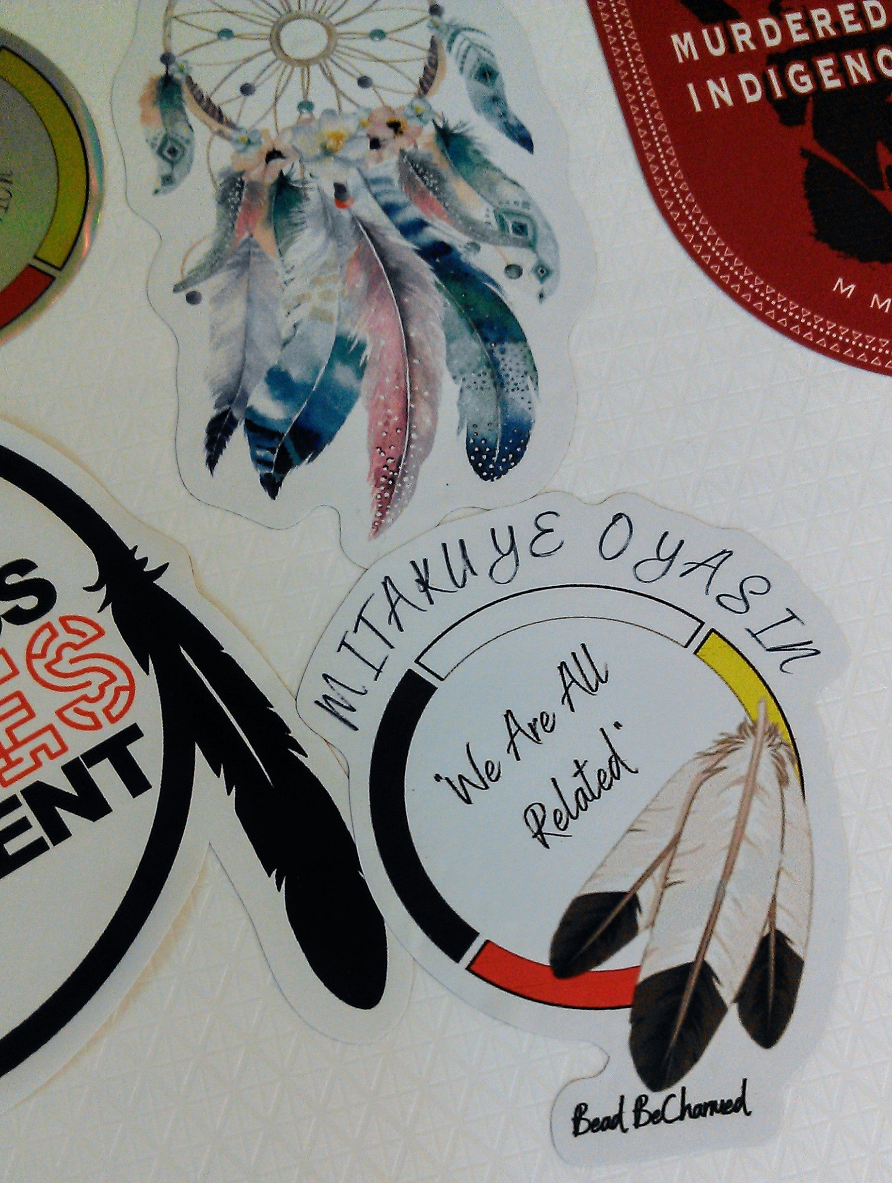 These vibrant colored, durable vinyl stickers are made of a heavy-duty poly vinyl material that protects from sun fading, water and scratching. These are high quality, professionally printed die-cut stickers featuring original mixed media artwork created by a mixed race Indigenous artist. Colors of the sticker design can vary slightly due to differences in screen resolution, but don't worry, they are great looking stickers! They aren't your typical 'printed-at-home' type stickers, and their quality will show it!