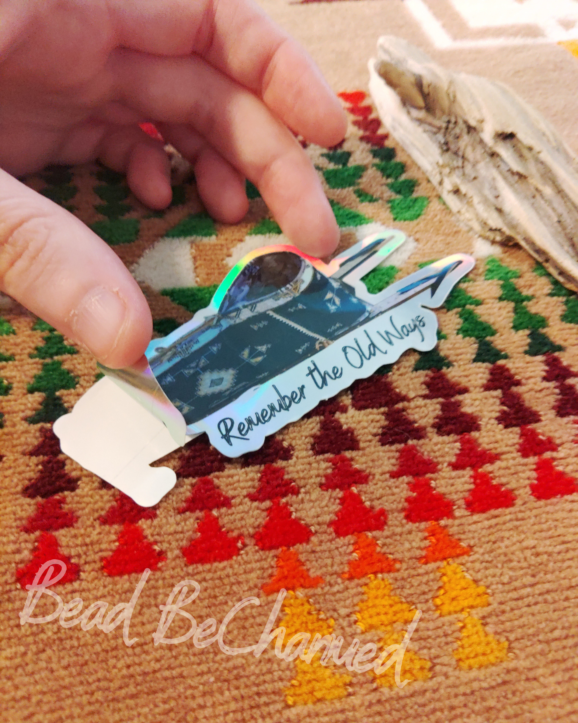 One of my favorite designs! This sticker features 'Otter Spirit', a full-size beaded cradleboard I recently finished, with the reminder 'Remember the Old Ways'. Cradleboards, moss bags, and similar items are seeing a return to use and popularity among Indigenous cultures, showing that the old ways of Native American parenting are still very important in today's modern cultures. Traditionally cradleboards were given as a gift for a new baby and symbolize love, honor, and protection for the new generation. 'Old Ways' is a reminder that Native women and children are sacred and need to be protected for the future of our People all over Turtle Island. What better way to remind everyone than with a bright-colored, holographic sticker to catch their eye?